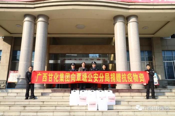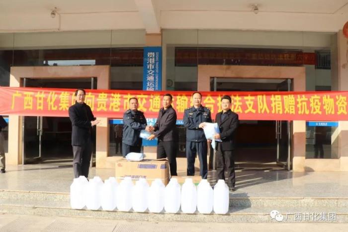 2021年1月18日、19日,廣西甘化集團有限公司疫情防控物資捐贈儀式分別在貴港市交通運輸綜合執法支隊和貴港市覃塘公安分局辦公大樓前舉行,執法支隊姚厚才支隊長、陳剛副支隊長,覃塘區公安分局吳顯臣副局長,甘化集團副總裁黃敏昭、貴港甘化股份有限公司副總經理劉曉東、人事總監甘春鋒出席捐贈儀式。