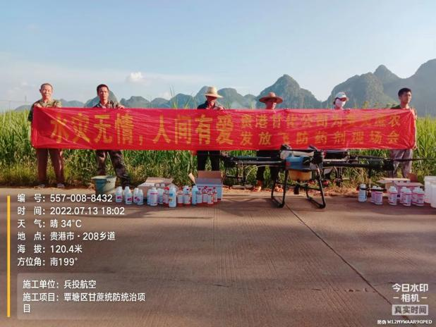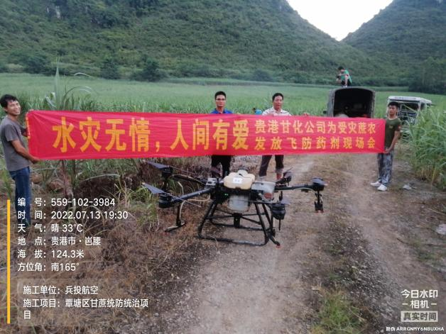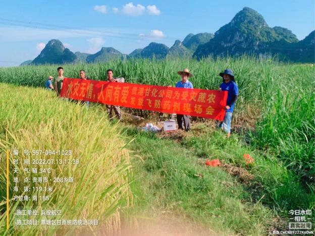 對此,貴港甘化公司領導班子高度重視,制定了災后生產恢復緊急預案,一是為蔗區蔗農免費提供殺菌劑、殺蟲劑和葉面肥;二是組織農務部技術人員下鄉,引導蔗農進行生產自救。截至目前,貴港甘化公司已為貴港市種植大戶免費提供兩次飛防藥劑,飛防作業救災面積達7萬