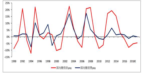 國內(nèi)糖產(chǎn)量呈現(xiàn)三年增、三年減周期